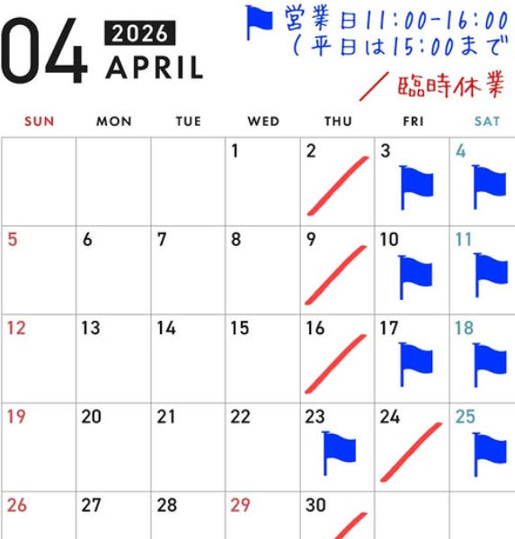 | open | 木・金・土 11:00~16:00(平日は~15:00) (売切れ閉店) |